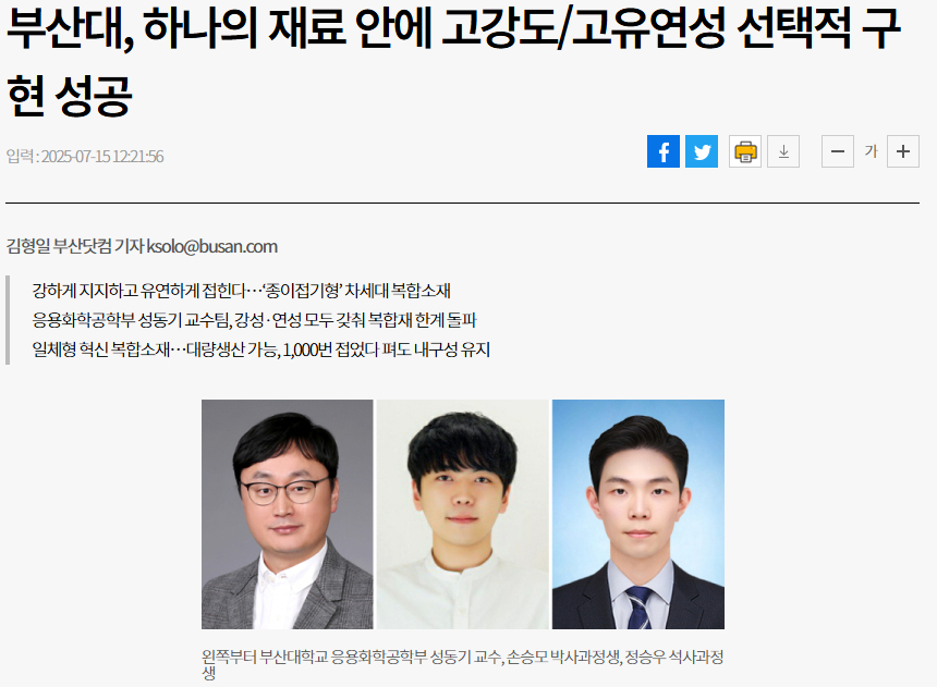 손승모(1저자), 정승우 학생이 연구한 일체형 강·연성 복합재료 개발 연구결과가 최근 국내 주요 언론에 소개되었습니다.